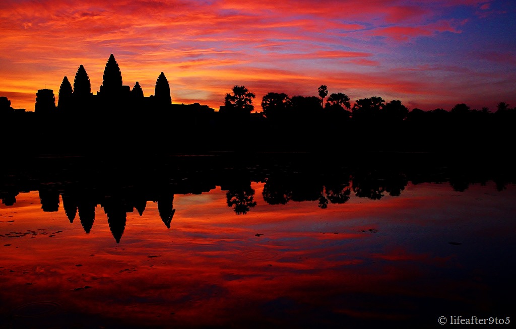 This picture was taken in the early morning at Angkor Wat. We sat, along with hundreds of other photo aficionados, patiently waiting for the sun to peak out from the dark horizon. As the sun rose over the the ancient empire, the rich colors layered on top of each other creating an effect like the sky and the water were on fire. We were rewarded with this beautiful, unforgettable sight.
