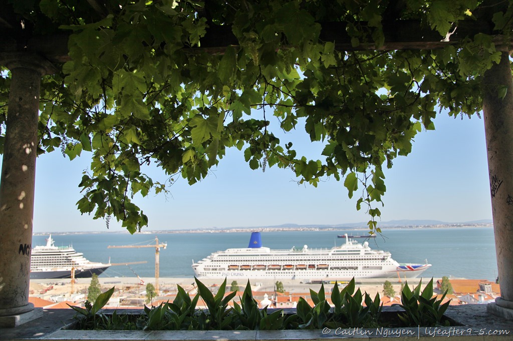 The terrace next to a small church of the same name, offers a beautiful panoramic view over the city’s oldest district. The dome of the National Pantheon and the bell-tower of São Miguel stand out among the rooftops of Alfama. The convoluted maze of small streets leading down to the river Tagus where two large cruise ships were docked at the harbor for the day, letting off visitors from far and wide.