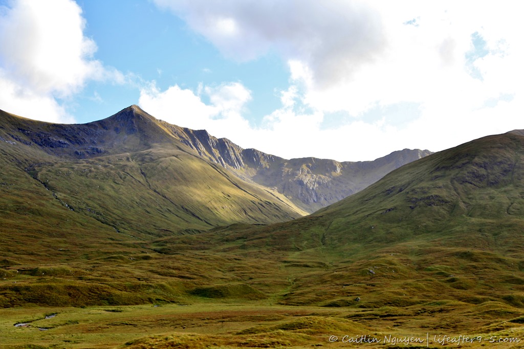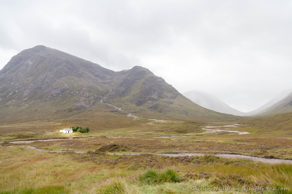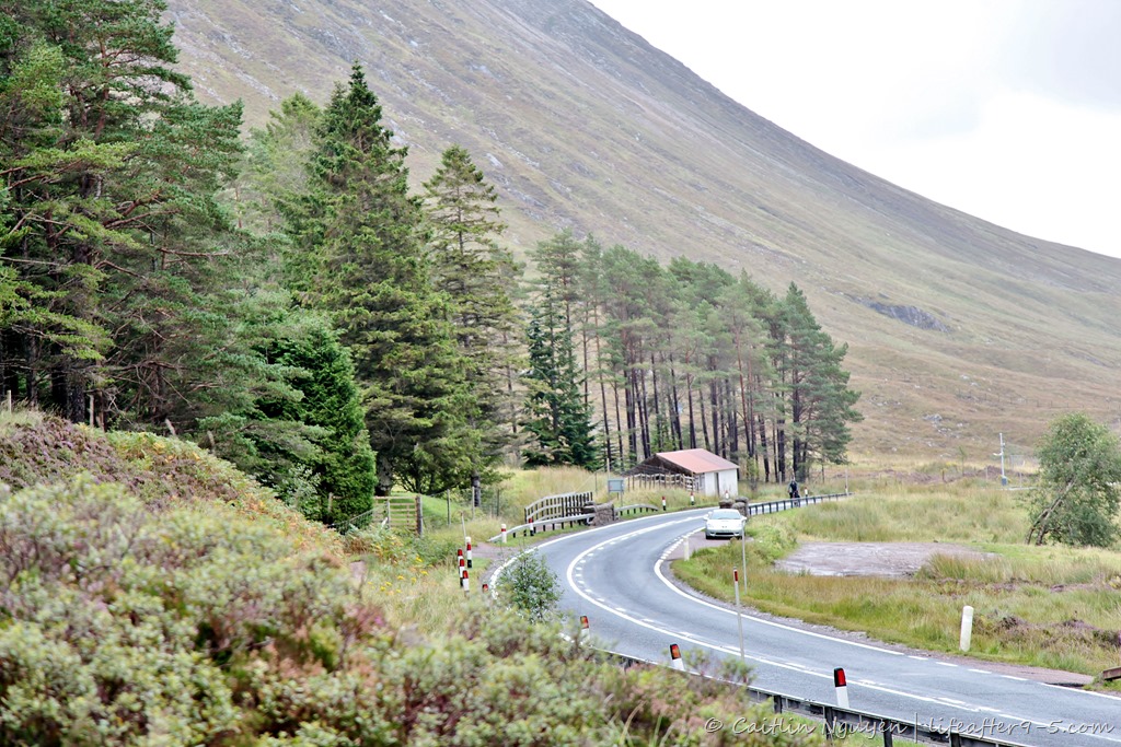 The A82 is one of the most beautiful roads in Scotland running from Glasgow to Inverness. The most impressive section goes through the magical Glen Coe full of high summits, desolate landscapes, and lochs. Right off of the highway is the Three Sisters viewing point where you can pull over and marvel at the majestic mountain ranges. It was a wet and windy day, and the mountains were covered in thick cotton clouds turning everything grey.