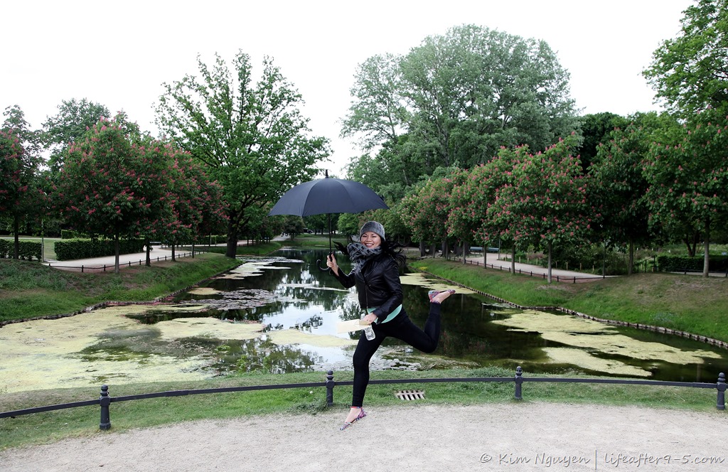 Our last day in Berlin was overcast and dreary.  Instead of letting it deter us, we grabbed an umbrella and headed out to the largest public park in Berlin. Walking through Tiergarten, we had a little fun with our umbrella trying to see who can have the best ‘swept away’ pose. Clearly Kim won.